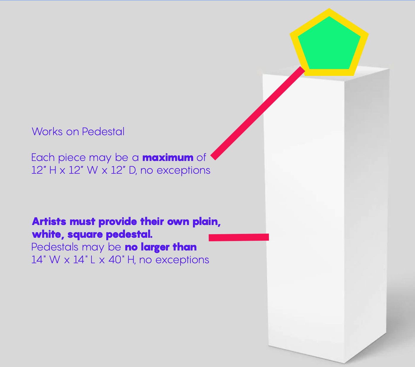 Artists must provide their own plain, white, square pedestal, no exceptions